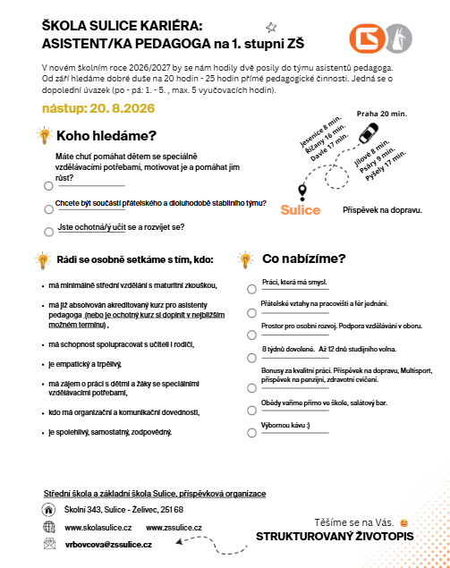 Rádi uvítáme zkušené učitele i studenty vyšších ročníků vysokých škol, kteří by chtěli rozvíjet svůj talent a stát se součástí přátelského pracovního kolektivu.